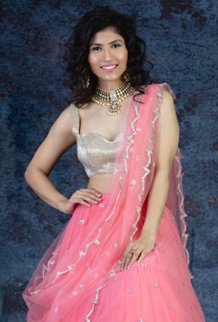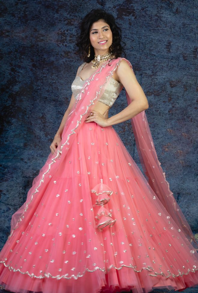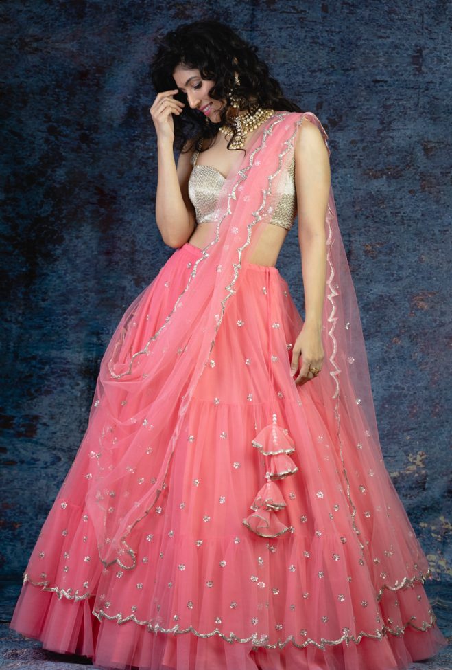 Hand embroidered cutwork lehenga and dupatta teamed with full sleeves zardozi croptop.