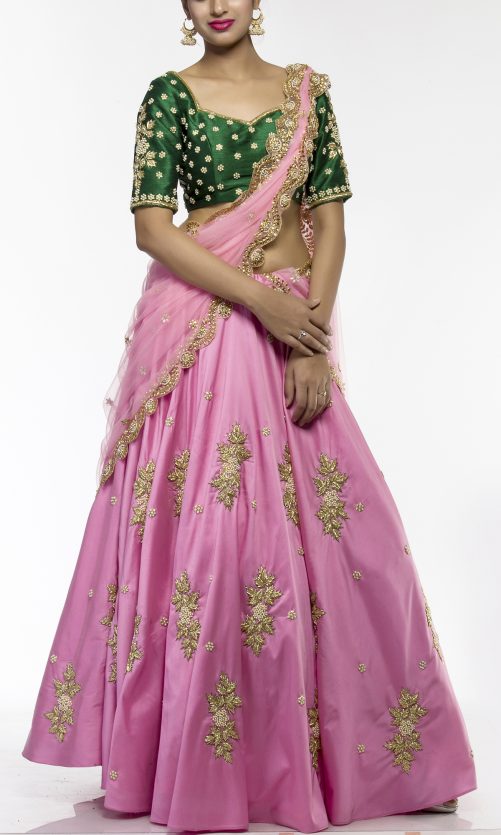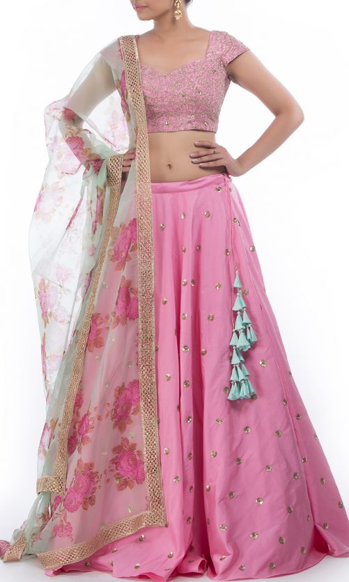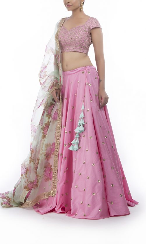Select options This product has multiple variants. The options may be chosen on the product page Carnation Pink Silk Lehenga Rs. 45,000