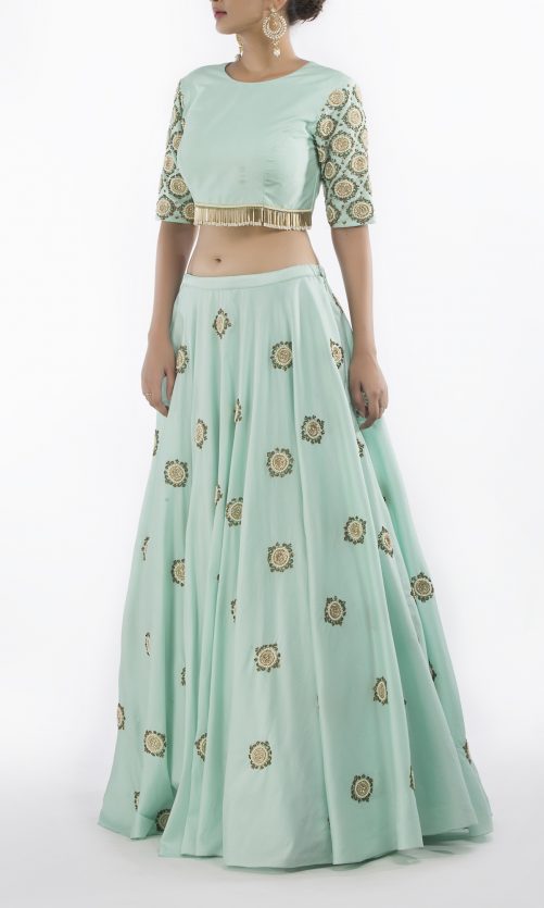 Select options This product has multiple variants. The options may be chosen on the product page Pear Green Pearl Work Lehenga Rs. 30,000